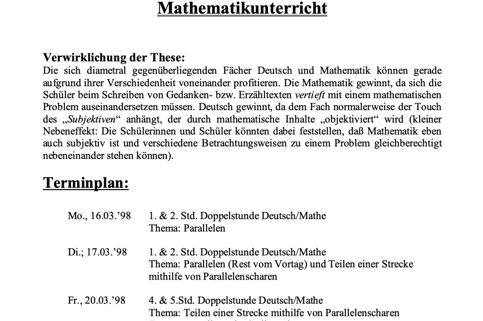 Für mich war damals besonders interessant, wie im Fach Deutsch an die selbst produzierten Texte herangegangen wurde (individuelle Rückmeldung, Überarbeitung) und dass die zu erlernenden Aspekte an mathematischen Inhalten erlernt werden konnten. Am „Tag der offenen Tür“ konnten einige Beiträge aus den Lerntagebüchern ausgestellt werden, was die Schüler:innen sehr stolz machte.