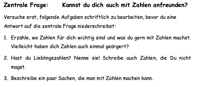 Eine Geschichte wird erzählt, eine zentrale Frage zum Thema aufgeworfen. Ein Auftrag, den die Schüler:innen dann erhalten, hilft mit Impulsen / Fragestellungen eine persönliche Antwort auf die zentrale Frage zu finden. Die Schüler:innen dokumentieren dabei ihre Lernwege und Überlegungen im Lerntagebuch. In Mathematik enthält dieses dann z.B. nicht nur Rechnungen und Aufgaben, sondern eher rechnerische Versuche mit Kommentaren, die die Befassung mit der Sache aufzeigen.