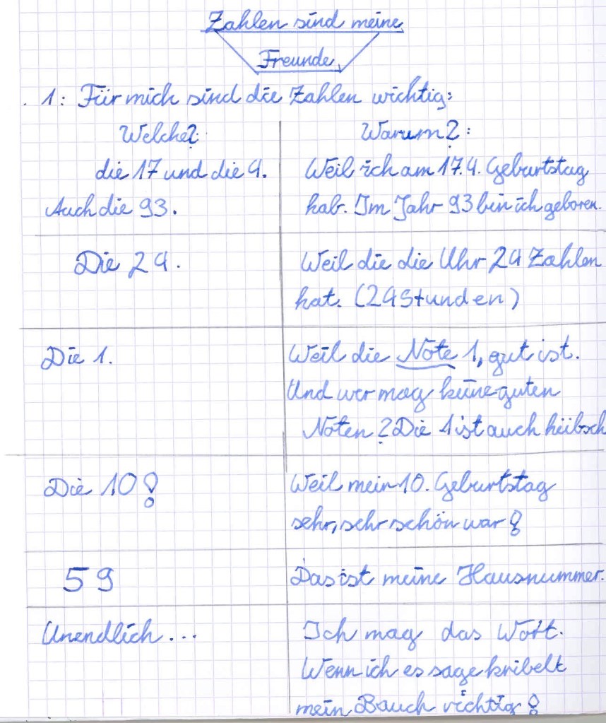 Ein erster Auftrag im Mathematikunterricht Kl. 5 soll die Kinder an das Schreiben im Mathematikunterricht heranführen. Diana antwortet auf die Impulsfragen des Auftrages:
