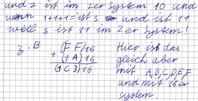 „2 ist im 2er-System (10)b und wenn 1+1+1 = 3 und ist (11)b im 2er-System! Hier ist es gleich, aber mit A,B,C,D,E,F und mit 16er-System.„