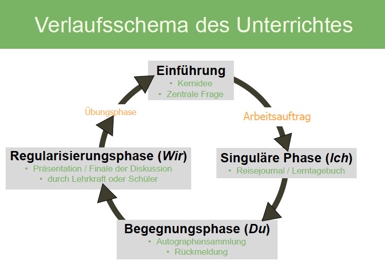 Die Lehrkraft führt durch eine persönliche Erzählung oder durch eine Kernidee aus einem Schüler-Lerntagebuch zum vorausgegangenen Auftrag o.ä. in einen neuen Themenaspekt ein, stellt die zentrale Frage und skizziert wesentliche Gedanken dazu. In einem Auftrag wird die zentrale Frage nochmals schriftlich gefasst und Impulse zur Beantwortung bzw. kleinere Fragen dazu gestellt. Die Schüler:innen bearbeiten den Auftrag in ihrem Lerntagebuch (zu Hause oder im Präsenzunterricht, synchron oder asynchron) schriftlich.